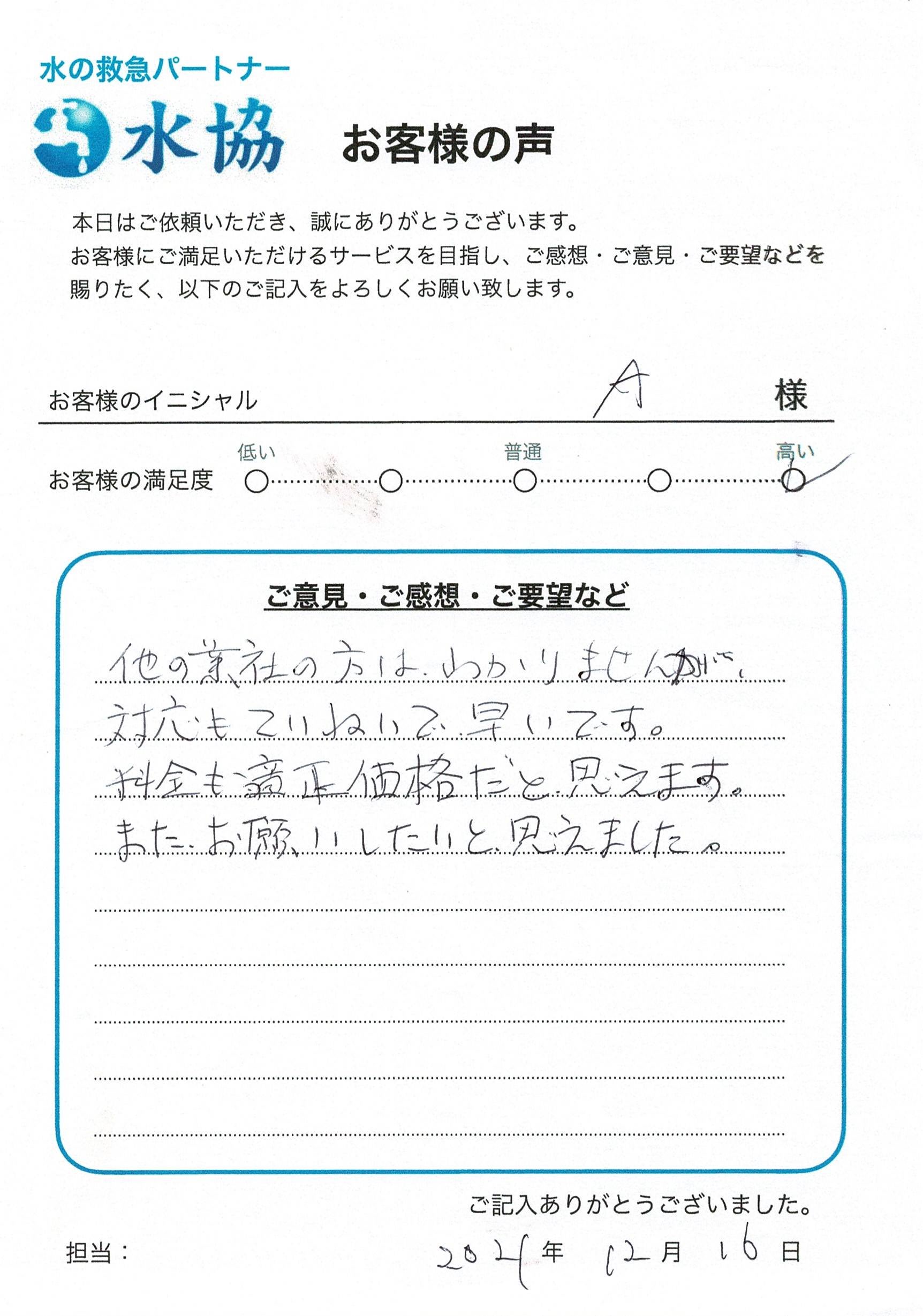 西宮市 | お客様持ち込みカードリッジ交換 Posted on 2022年10月20日 by gen ★★★★☆ S.E様 50代女性 連絡後、当日中に来て下さいました。 丁寧に説明をして下さり、こちらの要望にも快く応じて下さり、修理して下さいました。 お陰様で水漏れがおさまり助かりました。 ありがとうございました。 この度は洗面所の水漏れ修理ご依頼ありがとうございました。弊社スタッフの対応にもご満足いただけたようで何よりでございました。水協では修理技術はもちろん、接客やマナーなどの研修も受けた専属のスタッフがお伺いいたしますので、また何かございましたらいつでも安心してお声掛けくださいませ!